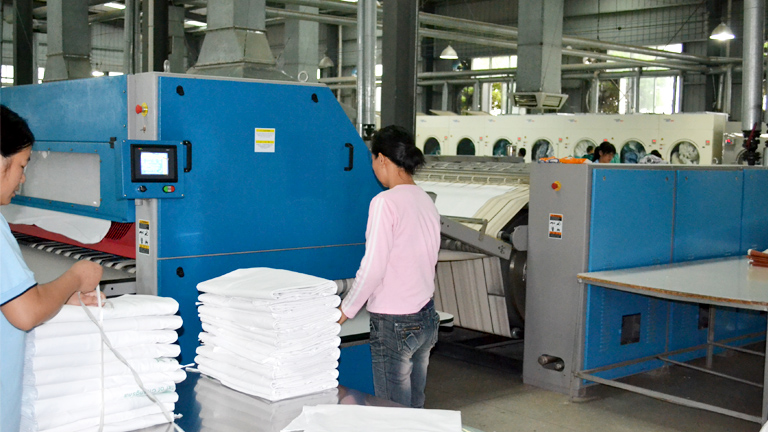 洗衣房機(jī)器的智能化大大降低了人力成本,經(jīng)過自動(dòng)折疊機(jī)的床單十分工整。